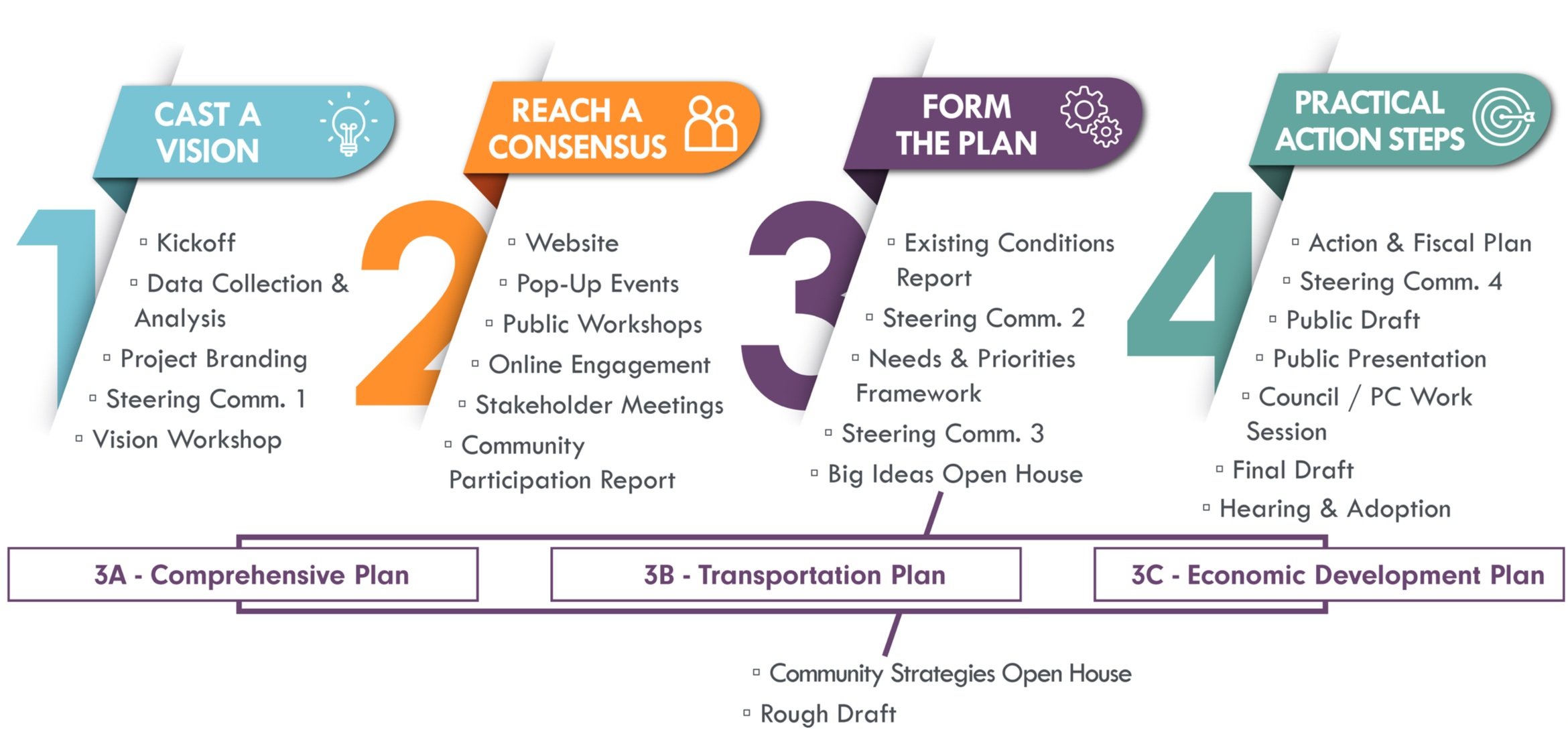 In addition to broader engagement events, the process will be guided by the project steering committee. Additional targeted stakeholder outreach will occur to engage leaders and professionals related to plan topics such as utilities, housing, education, arts and culture, preservation, recreation, community services, transportation, economic development,