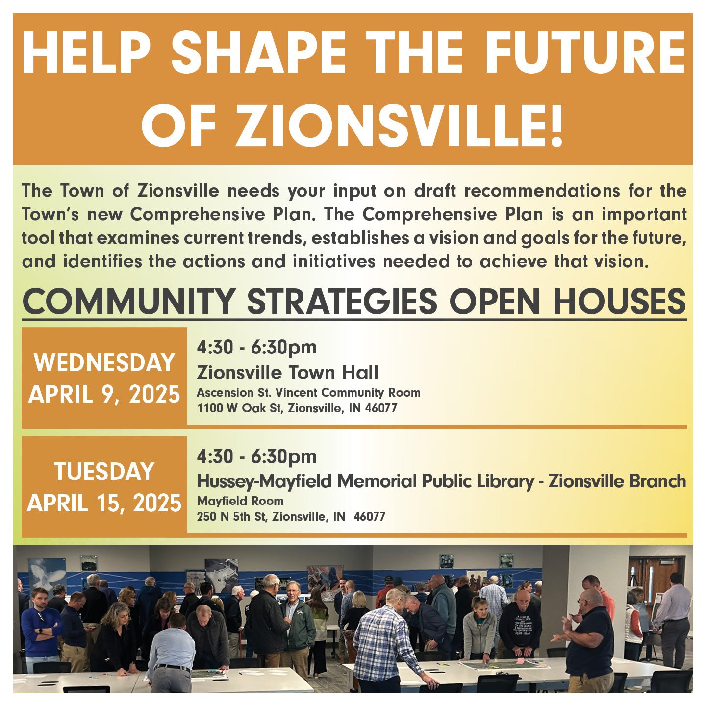The Town of Zionsville needs your input on draft recommendations for the Town’s new Comprehensive Plan. The Comprehensive Plan is an important tool that examines current trends, establishes a vision and goals for the future, and identifies the actions and initiatives needed to achieve that vision.